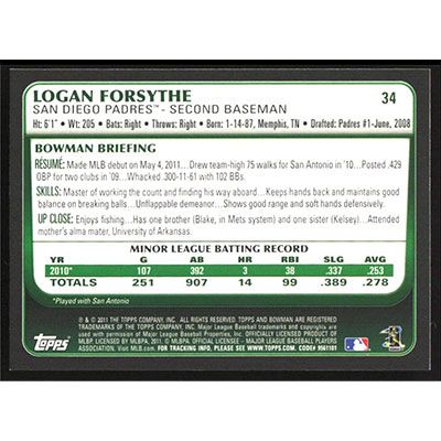 This is a 2011 Bowman Draft Logan Forsythe baseball card. The card is #34 and pictures show condition.
