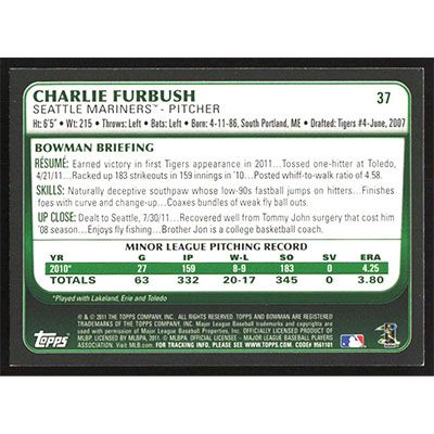 This is a 2011 Bowman Draft Charlie Furbush baseball card. The card is #37 and pictures show condition.
