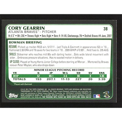 This is a 2011 Bowman Draft Cory Gearrin autographed baseball card. This card has been signed, in blue, by Cory Gearrin, and is guaranteed authentic by Ballcardz.com. The card is #38 and pictures show condition.