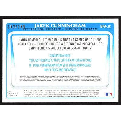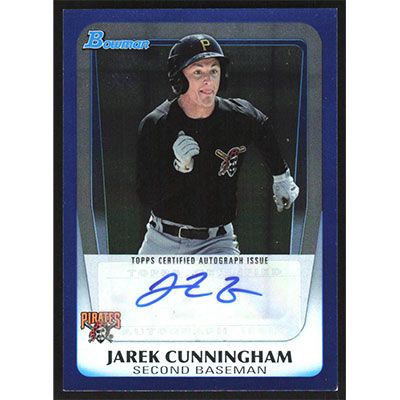 This is a 2011 Bowman Draft Prospects Autographs Blue Jarek Cunningham autographed baseball card. This card has been signed, in blue, by Jarek Cunningham, and is certified authentic by Topps. The card is #BPA-JC and pictures show condition. This card is limited; #'d 182/199.