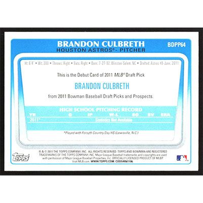 This is a 2011 Bowman Draft Prospects Brandon Culbreth baseball card. The card is #BDPP64 and pictures show condition.