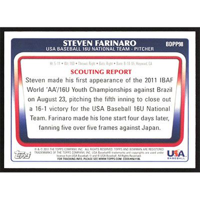 This is a 2011 Bowman Draft Prospects Steven Farinaro baseball card. The card is #BDPP98 and pictures show condition.