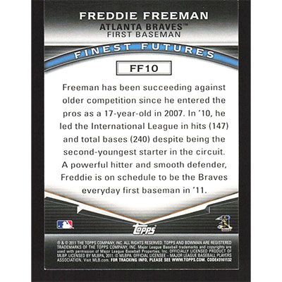 This is a 2011 Bowman Finest Futures Freddie Freeman baseball card. The card is #FF10 and pictures show condition.