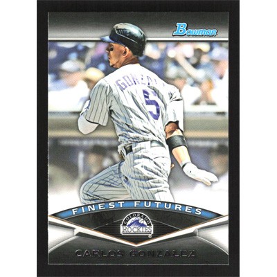 This is a 2011 Bowman Finest Futures Carlos Gonzalez baseball card. The card is #FF22 and pictures show condition.