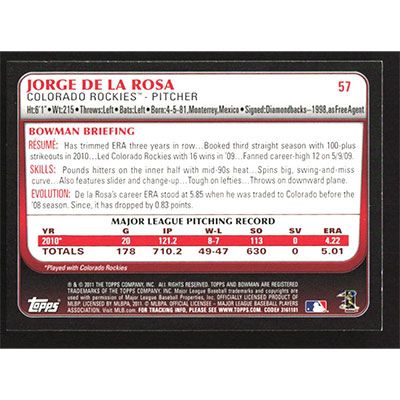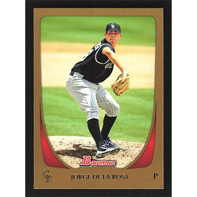 This is a 2011 Bowman Gold Jorge De La Rosa baseball card. The card is #57 and pictures show condition.