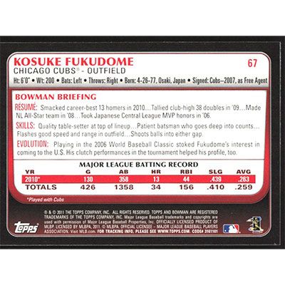 This is a 2011 Bowman Gold Kosuke Fukudome baseball card. The card is #67 and pictures show condition.