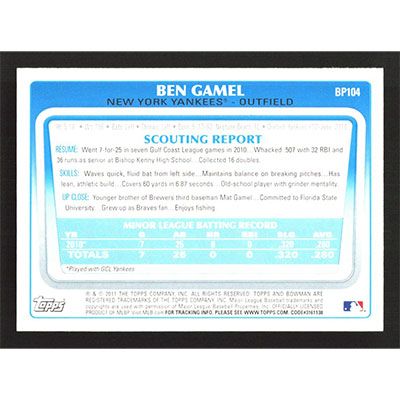 This is a 2011 Bowman Prospects Ben Gamel baseball card. The card is #BP104 and pictures show condition.