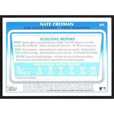 This is a 2011 Bowman Prospects Nate Freiman baseball card. The card is #BP4 and pictures show condition.