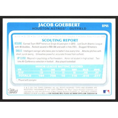 This is a 2011 Bowman Prospects Jacob Goebbert autographed baseball card. This card has been signed, in blue, by Jacob Goebbert, and is guaranteed authentic by Ballcardz.com. The card is #BP65 and pictures show condition.