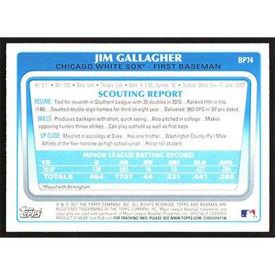 This is a 2011 Bowman Prospects Jim Gallagher baseball card. The card is #BP74 and pictures show condition.