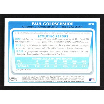 This is a 2011 Bowman Prospects Paul Goldschmidt baseball card. The card is #BP99 and pictures show condition.