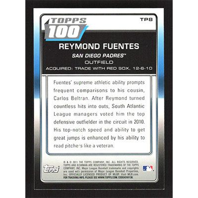 This is a 2011 Bowman Topps 100 Reymond Fuentes baseball card. The card is #TP8 and pictures show condition.