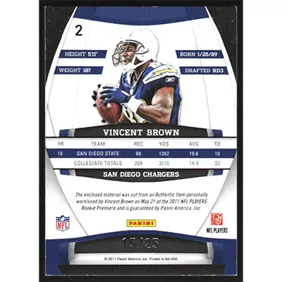 This is a 2011 Panini Gridiron Gear Rookie Gridiron Gems Jerseys Vincent Brown football card. The card is #2 and pictures show condition. This card is limited; #'d 15/25.