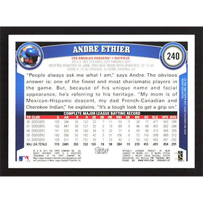 This is a 2011 Topps Andre Ethier baseball card. The card is #240 and pictures show condition.