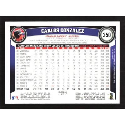 This is a 2011 Topps Carlos Gonzalez baseball card. The card is #250 and pictures show condition.