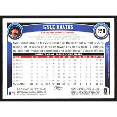 This is a 2011 Topps Kyle Davies autographed baseball card. This card has been signed, in blue, by Kyle Davies, and is guaranteed authentic by Ballcardz.com. The card is #259 and pictures show condition.