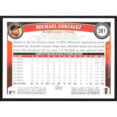 This is a 2011 Topps Mike Gonzalez baseball card. The card is #381 and pictures show condition.