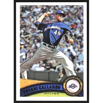 This is a 2011 Topps Yovani Gallardo baseball card. The card is #465 and pictures show condition.