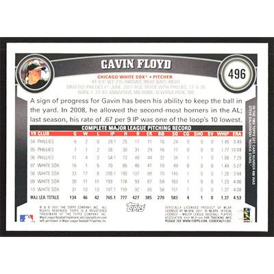 This is a 2011 Topps Gavin Floyd baseball card. The card is #496 and pictures show condition.