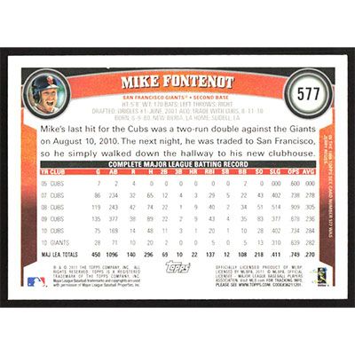 This is a 2011 Topps Mike Fontenot baseball card. The card is #577 and pictures show condition.