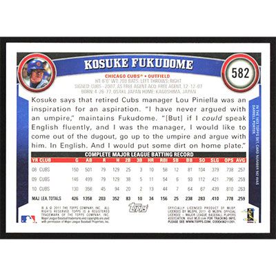 This is a 2011 Topps Kosuke Fukudome baseball card. The card is #582 and pictures show condition.