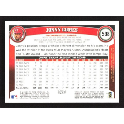 This is a 2011 Topps Jonny Gomes baseball card. The card is #598 and pictures show condition.