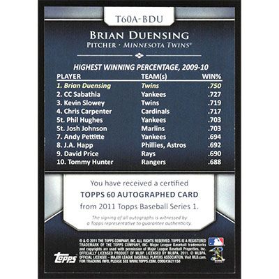 This is a 2011 Topps 60 Autographs Brian Duensing autographed baseball card. This card has been signed, in blue, by Brian Duensing, and is certified authentic by Topps. The card is #T60A-BDU and pictures show condition.