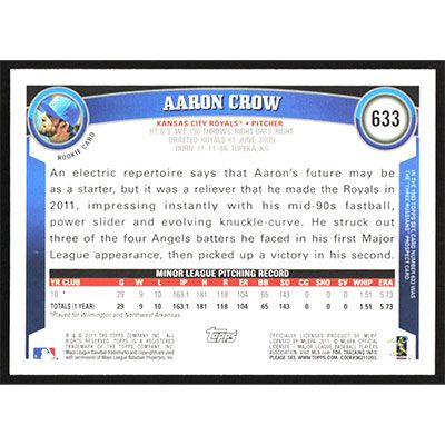 This is a 2011 Topps Aaron Crow baseball card. The card is #633 and pictures show condition.