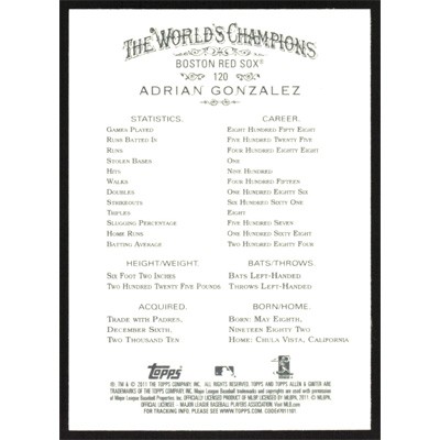 This is a 2011 Topps Allen & Ginter Adrian Gonzalez baseball card. The card is #120 and pictures show condition.