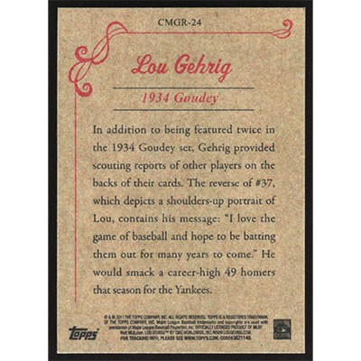 This is a 2011 Topps CMG Reprints Lou Gehrig 1934 Goudey baseball card. The card is #CMGR-24 and pictures show condition.