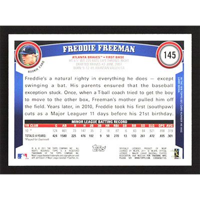 This is a 2011 Topps Cognac Diamond Anniversary Freddie Freeman baseball card. The card is #145 and pictures show condition. Team(s): Atlanta Braves Rookie Card (RC)