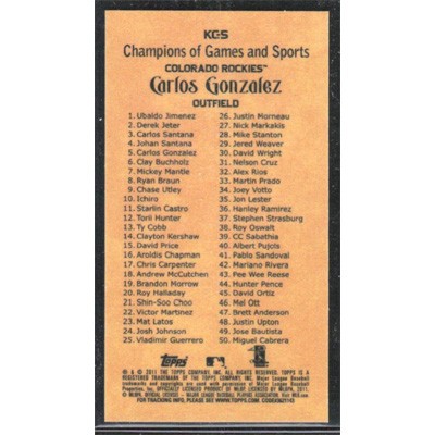 This is a 2011 Topps Kimball Champions Carlos Gonzalez baseball card. The card is #KC-5 and pictures show condition.