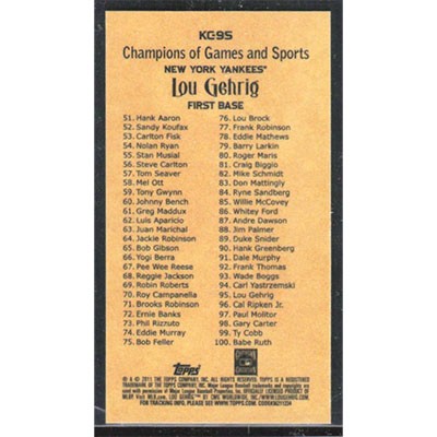 This is a 2011 Topps Kimball Champions Lou Gehrig baseball card. The card is #KC-95 and pictures show condition.