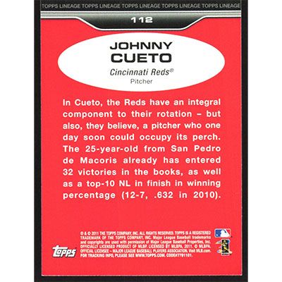 This is a 2011 Topps Lineage Johnny Cueto baseball card. The card is #112 and pictures show condition.