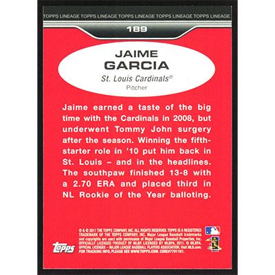 This is a 2011 Topps Lineage Jaime Garcia baseball card. The card is #189 and pictures show condition.