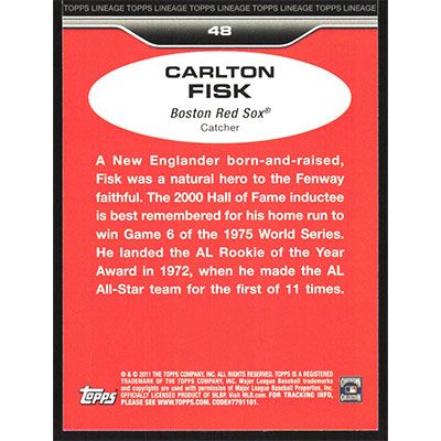This is a 2011 Topps Lineage Carlton Fisk baseball card. The card is #48 and pictures show condition.