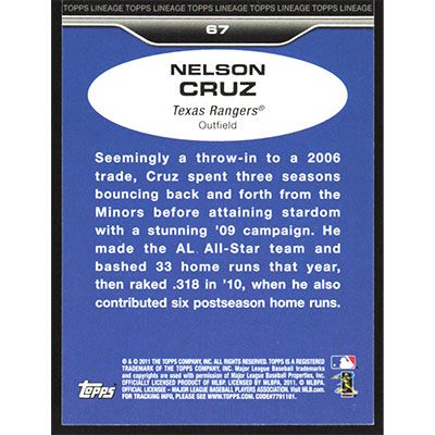 This is a 2011 Topps Lineage Nelson Cruz baseball card. The card is #67 and pictures show condition.
