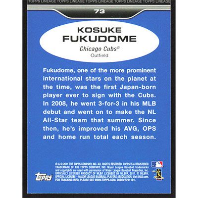This is a 2011 Topps Lineage Kosuke Fukudome baseball card. The card is #73 and pictures show condition.