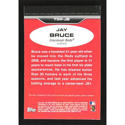 This is a 2011 Topps Lineage '75 Mini Relics Jay Bruce Jersey baseball card. The card is #75R-JB and pictures show condition.