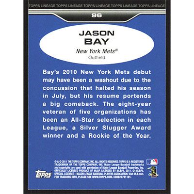 This is a 2011 Topps Lineage Jason Bay baseball card. The card is #96 and pictures show condition.