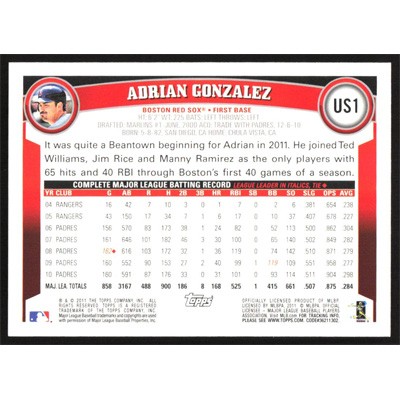 This is a 2011 Topps Update Cognac Diamond Anniversary Adrian Gonzalez baseball card. The card is #US1 and pictures show condition. Team(s): Boston Red Sox