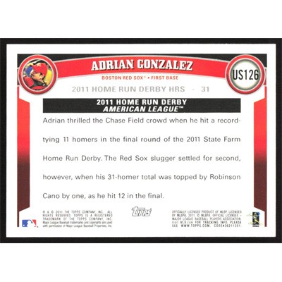 This is a 2011 Topps Update Adrian Gonzalez Home Run Derby baseball card. The card is #US126 and pictures show condition.