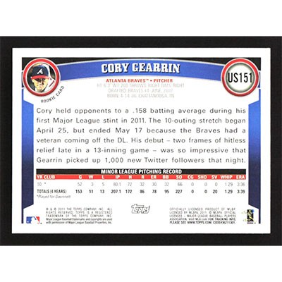 This is a 2011 Topps Update Cory Gearrin baseball card. The card is #US151 and pictures show condition.