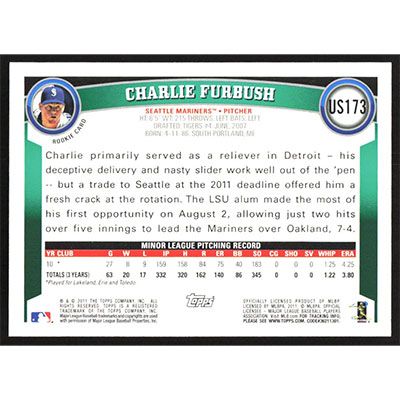 This is a 2011 Topps Update Charlie Furbush baseball card. The card is #US173 and pictures show condition. Team(s): Seattle Mariners Rookie Card (RC)