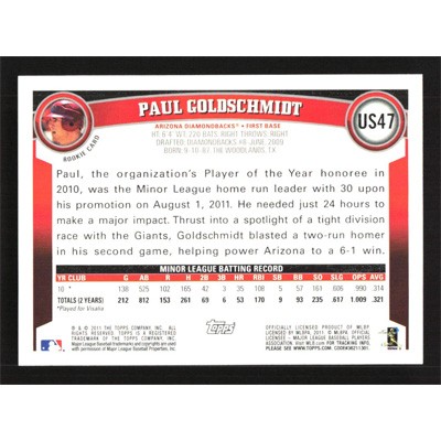 This is a 2011 Topps Update Paul Goldschmidt baseball card. The card is #US47 and pictures show condition. Team(s): Arizona Diamondbacks Rookie Card (RC)