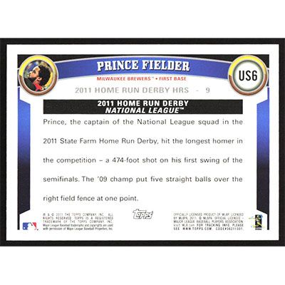 This is a 2011 Topps Update Prince Fielder Home Run Derby baseball card. The card is #US6 and pictures show condition.