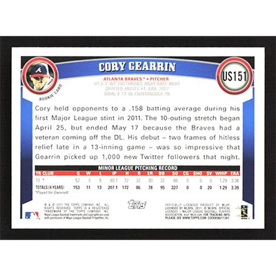 This is a 2011 Topps Update Wal-Mart Blue Cory Gearrin baseball card. The card is #US151 and pictures show condition. Team(s): Atlanta Braves Rookie Card (RC)