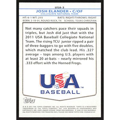 This is a 2011 USA Baseball Josh Elander baseball card. The card is #USA-3 and pictures show condition.