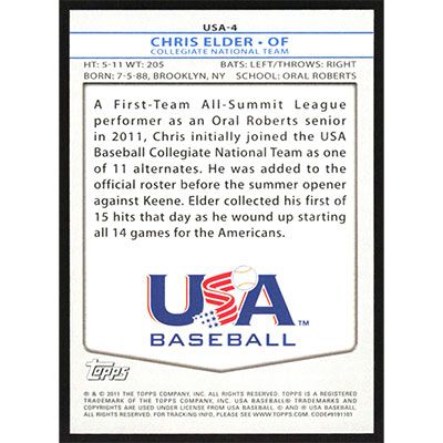 This is a 2011 USA Baseball Chris Elder baseball card. The card is #USA-4 and pictures show condition.