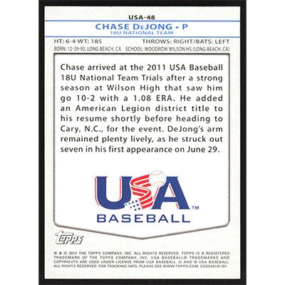 This is a 2011 USA Baseball Chase DeJong baseball card. The card is #USA-48 and pictures show condition.